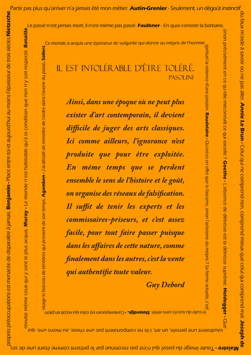 Que l’art aujourd’hui soit en crise ne devrait faire aucun doute pour toute personne de bonne foi ! Cette crise, je l’énoncerai ainsi : les artistes ne décident plus de ce que doit être l’art. De sorte que l’art contemporain se distingue radicalement de l’art moderne autant que du classique dont le point commun était, précisément, que les artistes décidaient de ce que doit être l’art. Les classiques en s’appuyant sur un métier appris, perfectionné, transmis et qui a produit quelques virtuoses. Les modernes, depuis le Romantisme, en redéfinissant l’art comme vocation où l’artiste n’exerce plus essentiellement un métier, mais expérimente. L’expérimentation rassemble toutes les démarches artistiques de la modernité : « Est expérimentateur celui qui, persuadé que le nouveau a toujours raison, se fie à n’importe quel résultat. » Peter Sloterdijk. Cette formule convient aux Impressionnistes, aux Demoiselles d’Avignon, aux recherches qui aboutiront à l’abstraction… mais tout autant à Proust, Joyce…Stravinsky… jusqu’à Klein ?